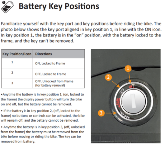 ① When the key is in position 1 (ON icon), the battery is on and locked to the bike frame. The power button on the bike can control its turning on and off.