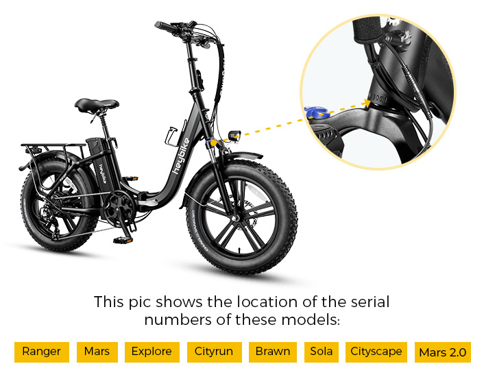 ① The serial number is printed on the head tube near the headlight for e-bike models: Mars 2.0, Mars, Brawn, Cityrun, Ranger, Explore, Sola, Cityscape.
